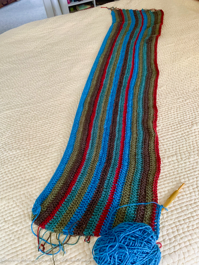 Progress so far. The colors are off because I had to lay this out on our bed and it’s still gloomy in that room. This little project is keeping me sane. Don really likes it, so that’s all that matters.