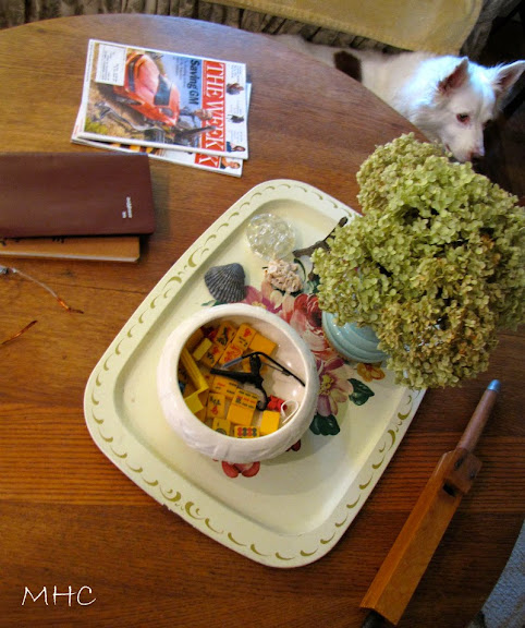 A somewhat grainy photo because it is so dark and stormy today – but it will do. All table tops are crowded around here. This table has become, through no plan on my part, all things sea. There is seaglass, a boat assemblage from Linda Crispell, and a Roseville dish loaded with seashells from my recent trip. I just added the dish the other day. There is a shelf beneath that holds some favorite CDs.
