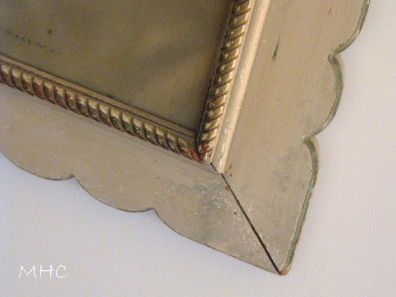 I fell in love with this print for two reasons. As you already know, I love flower paintings.  But the frame – oh, the frame. When I saw that scalloped edge with a hint of green, the obsession to own this took hold. We sat through a long night (this auctioneer was very slow) and it almost didn’t come up for auction. I think it was around midnight and the auctioneer was starting to wind up the evening when I realized he might not get to it. So I shouted out that I wanted to bid on it. I was the only bidder and got it for $15.00. Take a look at the frame: