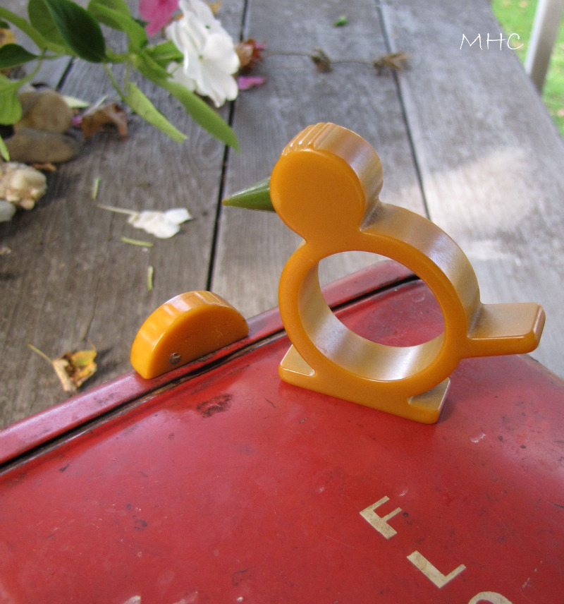 Hi Claudia, Joe had a few pieces of Bakelite silverware when we got married. Your collection is smashing. I did not notice the little green beak on the napkin ring but it is just darling. hugs♥O