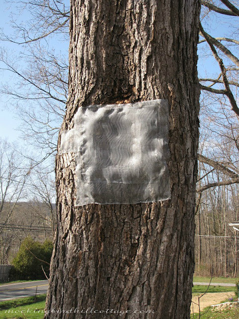 Fast forward to the present. I have been keeping an eye on the tree ever since it started getting warm and I hadn’t seen any bee activity. Don called Chris, who said if that was the case, the bees didn’t make it through the winter. I was greatly relieved and grateful that they died naturally. He told us to cover the holes with window screen mesh to discourage some new bee scout from attempting to set up camp there. So, besides cutting away brambles, that’s what we were doing that day by the Catalpa.