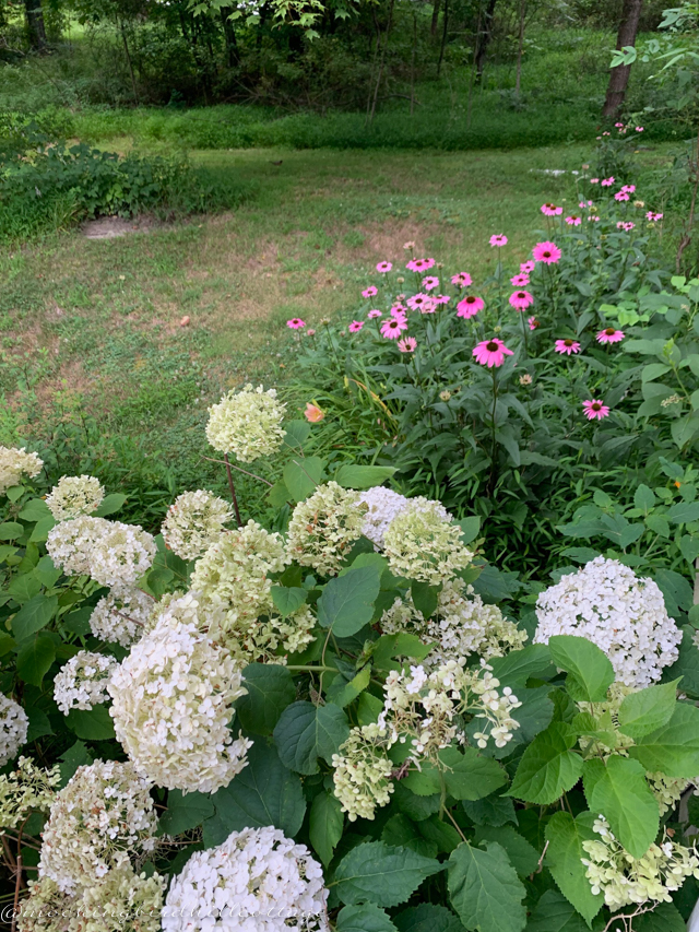 Yes, they’re everywhere – in front of the house, in the big garden bed, in the little bed by the porch, on the driveway side of the house, and on the far side of the house. Coneflowers are a gift; they reseed everywhere and if you love country gardens as I do, they provide most of the set design from mid-summer until autumn, The black-eyed susans are about ready to bloom, and some of the David phlox has bloomed. The rest of the phlox will bloom later because the nibbling deer delayed things.
