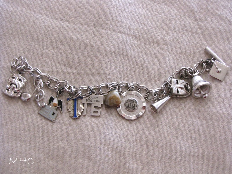 I recently found the charm bracelet I wore in high school. It looks just like new. Among the charms are Comedy/Tragedy masks, musical notes, a megaphone (because I directed a play in my senior year), a Thespian charm, a bell – I think it was for choir, a cap and diploma – and a Happy Birthday Sweet 16 charm. I remember that birthday. My friends threw a surprise party for my friend Wendy and me. Wendy’s birthday is the day after mine. It seems a lifetime ago, yet I can remember it all very clearly. I suppose in the time/space continuum it happened yesterday. Or is happening now. Or something like that. I’m a lot older than 16 now, but that 16 year old girl is still a part of me. I carry the little girl I once was, the pre-teen, the teenager, the young adult, and all the ‘me’s’ I have been over the years.