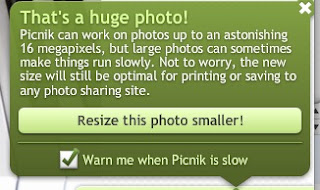 See the large numbers there? That means that my photo is 2640 x 1980 pixels.  That takes a lot of storage space. That’s why you see the exclamation point next to the size. If I click on that exclamation point, here is the message I get from Picnik:
