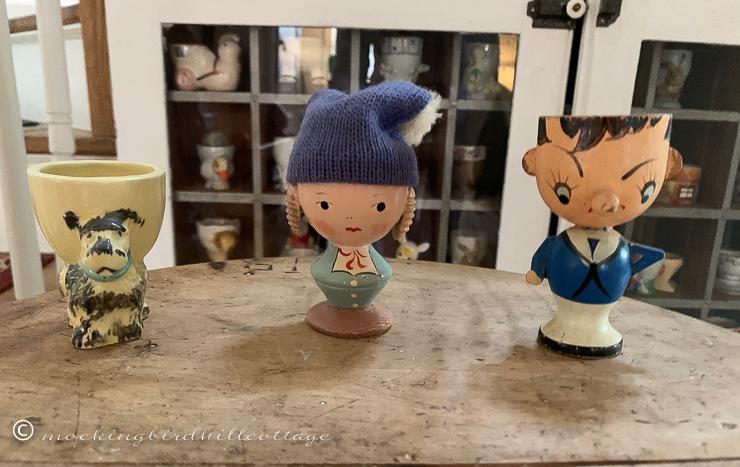 My wooden sailor egg cup. Don found this one in an antique shop and Scout decided to give it to me for my birthday. I researched this one. He was part of a series of egg cups that were sold by Woolworth’s in the 40s. Like the Sevi egg cup, he came with a white sailor cap. Alas, I don’t have it, but I’d sure love to find one.