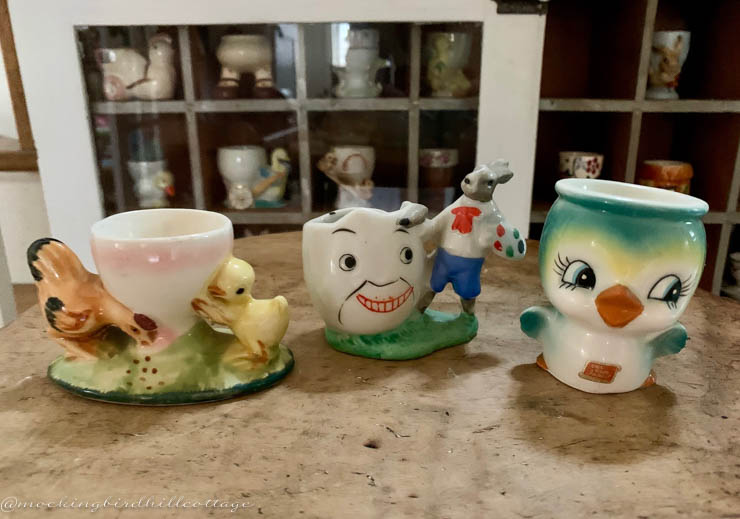 The center cup is one of my favorites and I rarely, if ever, see it these days. An artistic rabbit is painting an egg. He’s even holding a palette. Marked Japan.