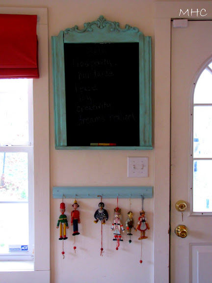 I like little touches of whimsy in my home. The finished project connects the color of the chalkboard and the red of the Roman shades and bench. And it made Don smile. Me, too.