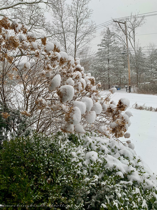 We got about 5 inches of snow, but the pretty fluffy snow we were envisioning was not to be. It was a heavy wet snow with gray skies. It was not particularly pretty until later in the afternoon when the flakes got bigger. We have a lot to clean up out there today and we’re not looking forward to it. We would love for someone to plow our driveway but since it is covered in Item 4 (a kind of gravel) and the plow has to go uphill, the gravel is plowed right up along with the snow. We’ve had it happen a few times in the past. That’s an expensive loss. This is the one time of the year that I envy our neighbors across the street who have flat properties and driveways.