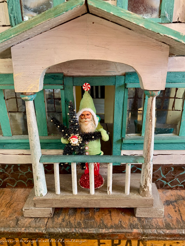 Santa is on the porch of the Folk Art dollhouse. (Made by Vintage by Crystal.)