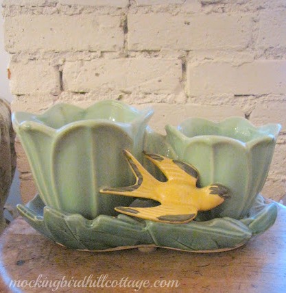 I need two houses right next door to each other! I love the colorful cottage style that incorporates McCoy pottery so well, and I love a spare farmhouse style with lots of white. The pastels are gorgeous, and the birds are so sweet. You have a very nice collection. Of course it’s kind of your signature. I think of your blog whenever I see an aqua piece when I’m out and about.