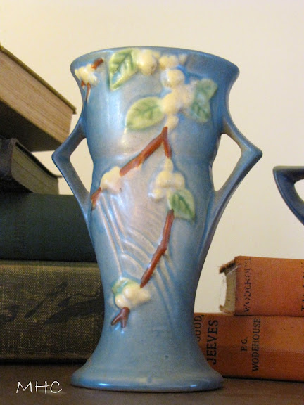 You’re looking at the top of my 30’s era china cabinet which is in our den.  On it sits my vintage Hendryx birdcage, several vintage and well-loved books and some of my Roseville pottery. When husband and I sit on the sofa and watch television, this cabinet is right in our sight-line (as we say in the theater.) The other evening, Don asked me to look closely at one of the pieces – this one: