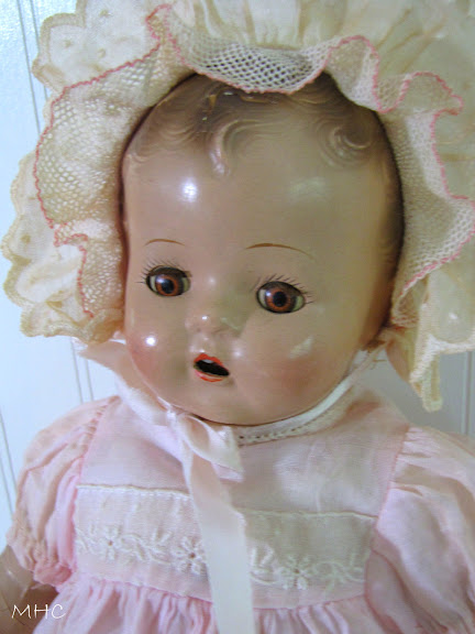 One day, about 5 months ago, I saw her. While exploring an Antique Center across the Hudson River from my home, I turned a corner and there she was. She was beautiful. I examined her more closely. Ah, some crazing, some damage to the legs….but her face was perfect. She was wearing her original pink dress, bonnet, shoes and socks.