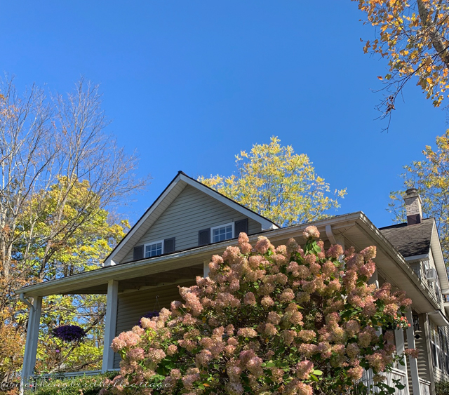 I walked around the property yesterday, taking photos of plants and trees that would be in peril after the frost. The limelight hydrangea, at its most intense pink color, will turn brown.