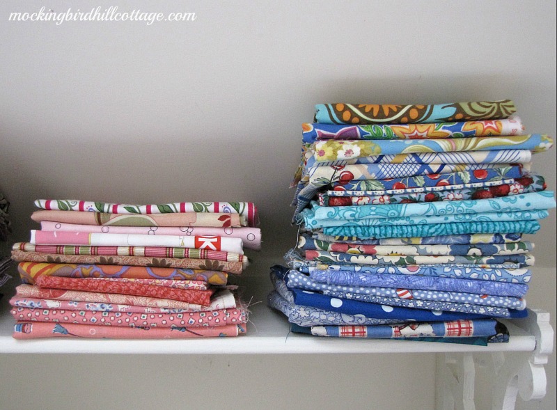 Your stash of fabric is wonderful. I love fabrics anyway, but a stack of colour co-ordinated fabrics gets my imagination going! Ik keep mine the same way, in a glss fronted cupboard so I can see them :-)