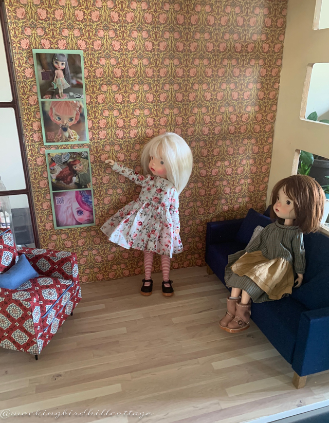 Roombox update. I added some photos to the wall. They are actually photo stickers of my friend Gwen’s Blythes. She sent them to me a couple of months ago. I’ve decided they are cousins to my girls. I painted the walls on either side of the box in a cream color. There is also a window on the right side of the wallpapered wall, but I covered it up. And now, I rather like the different patterns and colors. It suits a playful house.