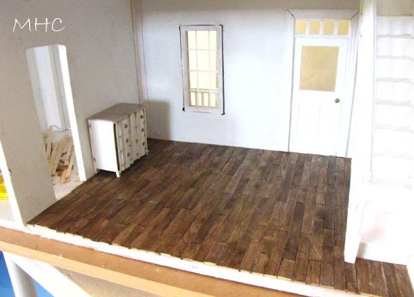 When last we left the dollhouse on Tuesday, I was in the midst of cutting popsicle sticks and staining them for the hardwood floor in the living room. In my usual obsessive fashion, I kept at it until late that night, determined to get it finished. It was rather like putting together a puzzle (and I love a good puzzle, especially the crossword variety) and time, patience and a lot of glue on my fingers paid off.