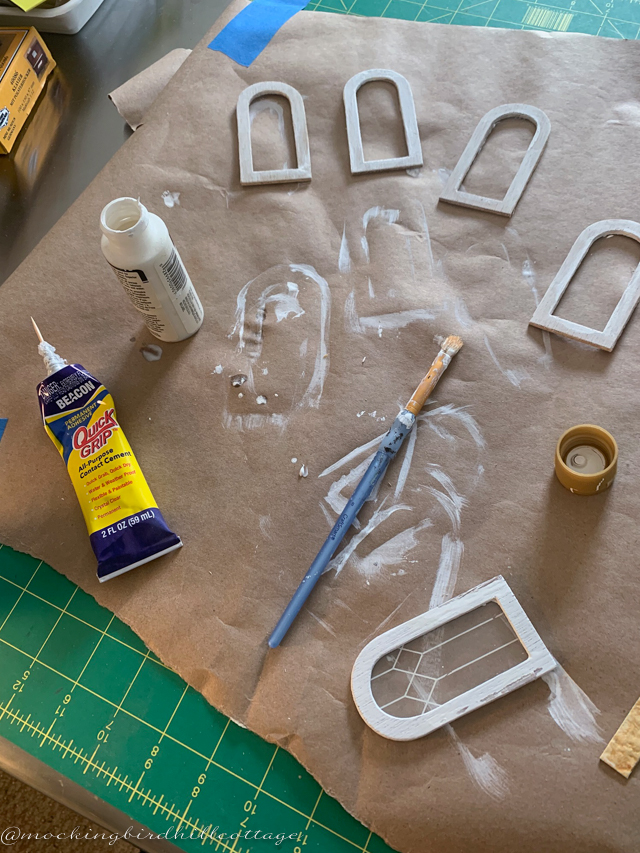 Several windows had to be fixed. They were either missing the acrylic window pane or part of the frame. Because I have an additional kit, I pulled frames and window sheets from there. It’s fiddly work. As I learned from working on Dove Cottage, Greenleaf dollhouse kits are inconsistent in execution. The parts don’t always match from kit to kit. So you have to cheat a little to get them to fit, or as in yesterday’s work, jam them in place.