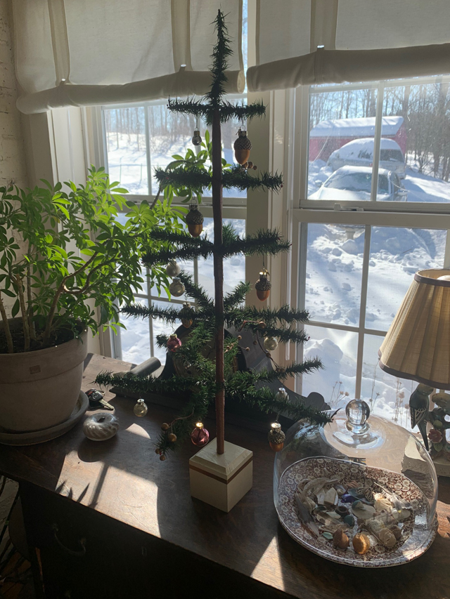 I was ready to store the feather tree because we needed the space on the coffee table. I temporarily stashed it on the sideboard. Turns out, at least for the time being, we like it there. Because that window gets a lot of sun, the ornaments sparkle.