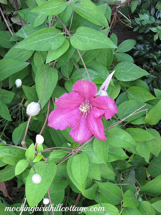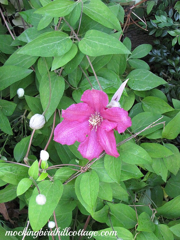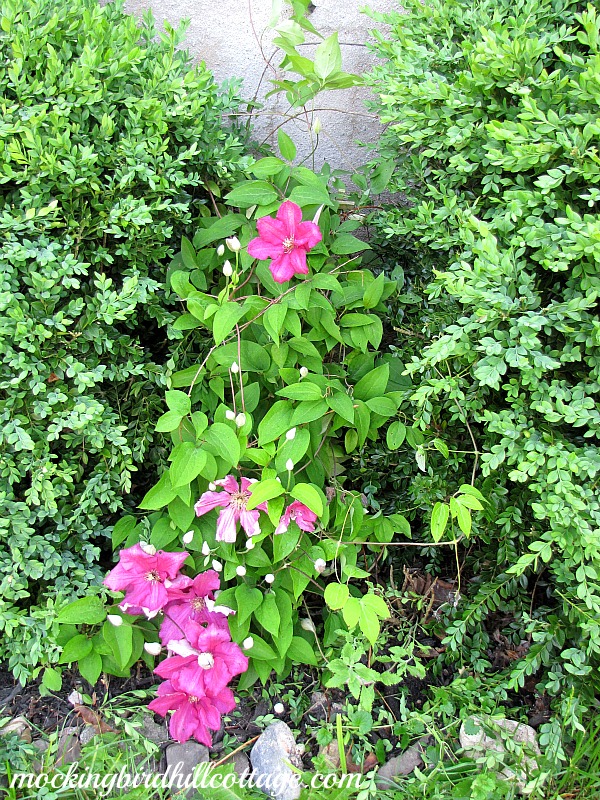 Your magenta clematis is a beautifully unexpected pop of color between the two boxwoods!