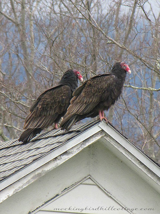 You have my turkey buzzards and you can keep them. I have been posting about these bad boys alot during the winter. We had around 200 that lived in our trees for 4 months. They are a far cry from gentle in my book. They are impossible to get to leave when they start roosting. I like the wild turkeys better. They are so funny walking all in a row without a care. Good pictures though.