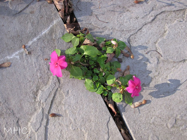 I’ve been discovering these little patches of impatiens in our little patio area where we have them planted in big barrels. They’ve reseeded. That’s never happened before. How lovely to come across this little autumn surprise.