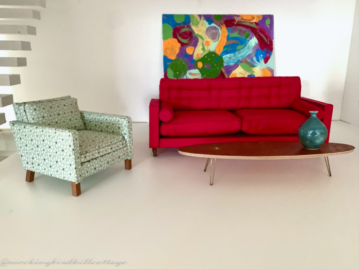 On Monday, I finally painted an abstract for the modern dollhouse. I wanted something rather large, so I found a good-sized canvas and went at it. It’s not so easy to paint something abstract, I have found, so it was a challenge. Originally, I was going to paint it in oils, but they take weeks to dry, and I didn’t want any of the paint coming off on the wall. So I grabbed the acrylics that I use for miniatures. I’m fairly pleased with it.