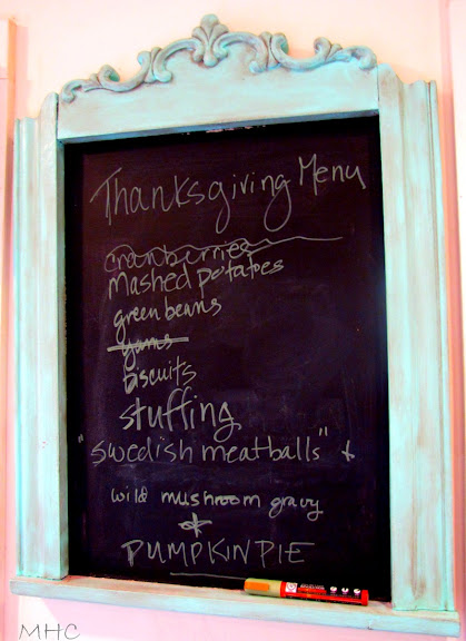 I have to say I love, love your chalkboard! It would look devine in my kitchen painted that same color:)We had thanksgiving today at my home, and yes we too ate too much. I am so ready to start the annual diet.