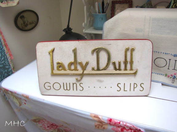 It’s made of very thick cardboard. The gold letters in ‘Lady Duff’ are raised. I’m a sucker for this type of art deco lettering and I had to bring it on home to the studio. At the moment, the sign is living right next to Letitia – she is, after all, wearing undergarments.
