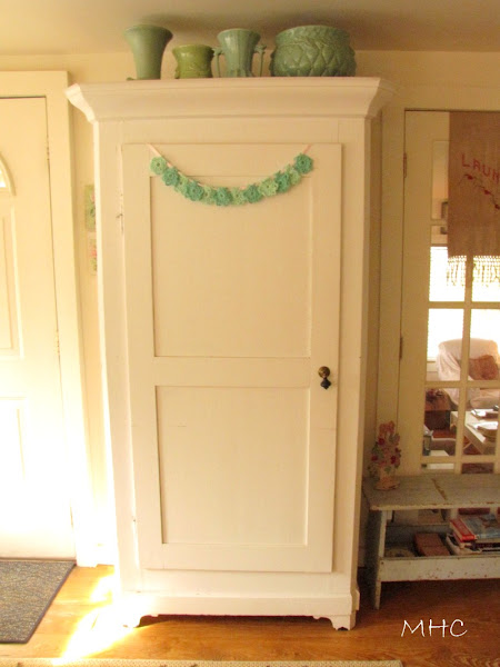 Love your living spaces, what a beautiful job you do, Claudia. The kitchen is so charming, and I really love that white cabinet with the turquoise knitted garland. You and Brenda both have a knack.