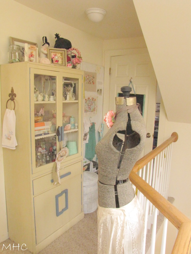 We have no space to store linens here. There is no quaint built-in linen closet like so many older homes have. Here’s another piece we bought at auction for $20. This cabinet is upstairs in the guest room. It took about a year for me to realize that the two shelves inside those doors would be perfect to store linens and towels. So our ‘linen closet’ isn’t conveniently located next to our main bathroom. In fact, it’s on the second floor. But it solves a major problem, as well as providing additional storage for quilts in the basket on top. (That’s a guitar case on the right. Guitars are everywhere here at MHC.)