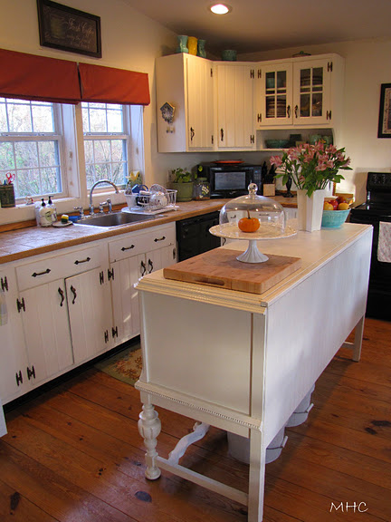 The other example takes us back to the kitchen. I’ve already said we don’t have enough cupboard space. We also don’t have enough counter space. To solve both those problems, I trotted off to my trusty friend, the auction, and for $60 bought an old, darkly stained sideboard. I painted it, added beadboard to the back and now I have a kitchen island.