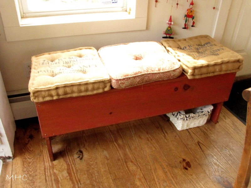 We have no space to store linens here. There is no quaint built-in linen closet like so many older homes have. Here’s another piece we bought at auction for $20. This cabinet is upstairs in the guest room. It took about a year for me to realize that the two shelves inside those doors would be perfect to store linens and towels. So our ‘linen closet’ isn’t conveniently located next to our main bathroom. In fact, it’s on the second floor. But it solves a major problem, as well as providing additional storage for quilts in the basket on top. (That’s a guitar case on the right. Guitars are everywhere here at MHC.)