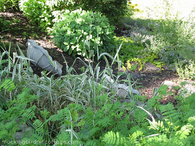 The main garden bed is lush and green. I shot this looking down on the bed from the patio area. There are the two pieces of the birdbath that was broken last year during Hurricane Irene.