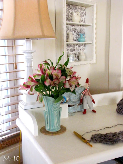 Fresh flowers, a mug of hot chocolate and some crocheting.