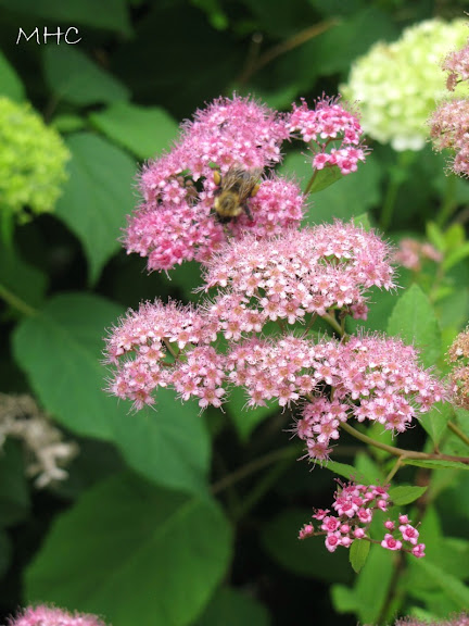 A bee sipping a little nectar from the Spirea.