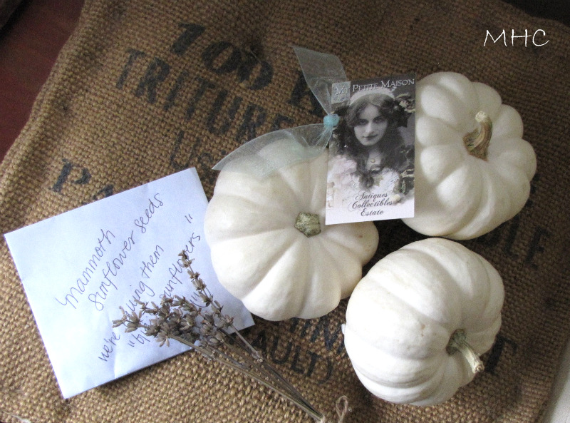 I received a package in the mail today from my friend Tracie of My Petite Maison. I had mentioned in  a comment that I can never find white pumpkins here…so she sent me some! She also sent along some sunflower seeds for my garden and some lavender.