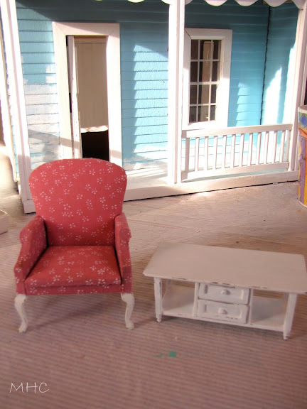Oh my gosh I love the chair shabbified. Love the coffee table too. How much fun you must be having working on this doll house. Makes me want to play also.