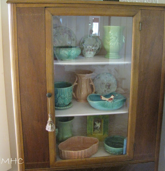 THIS CABINET is what I would call art deco…I am probably wrong but I LOVE IT AND YOU HAD TO PAINT the inside…you had no choice…….that beautiful cabinet was just made for your McCoy pottery….I could also see Fiesta in it…..hug your husband for letting you have the cabinet