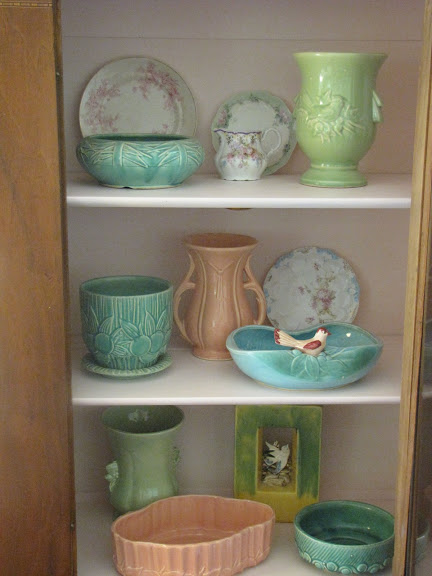 THIS CABINET is what I would call art deco…I am probably wrong but I LOVE IT AND YOU HAD TO PAINT the inside…you had no choice…….that beautiful cabinet was just made for your McCoy pottery….I could also see Fiesta in it…..hug your husband for letting you have the cabinet