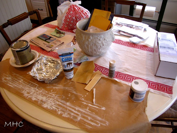 We’re back to the kitchen table. Unfortunately, it remains in it’s cluttered state. This time, we have the addition of paint, stain, sandpaper and all the things I use when working with my dollhouse and miniatures. The box on the right is the box the dollhouse wallpaper came in. I’m saving it because I like it’s shape. Why I haven’t put it away by now, I cannot say. Next to the box are the dreaded medical bills. I keep staring at them, willing some manna to drop from the heavens. The Target bag is my husband’s. I don’t know what’s in there. Then on the left, some cough drops, some mail, my husband’s glasses…and we’re back to the paint. And the pretty McCoy jardiniere is still holding the same stuff it did last time I took a photo of the table.