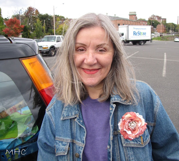 I had husband take a rather wind-blown picture of me in order to show the new flower pin on my jean jacket.