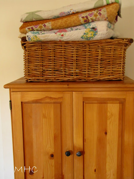 More quilts stacked in a wicker basket. This little armoire functions as our linen closet (sadly, older homes lack closet space.)