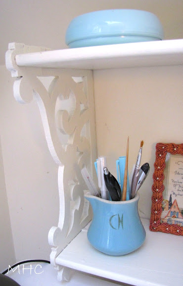 I also painted the shelf I discovered in the shed. It now has a home just above the sewing machine table. (Why I didn’t take a photo of it before I hung it, I’ll never know.) Because this little area is a niche under the skylight and can be dark, I had to fiddle a bit in Picnik.