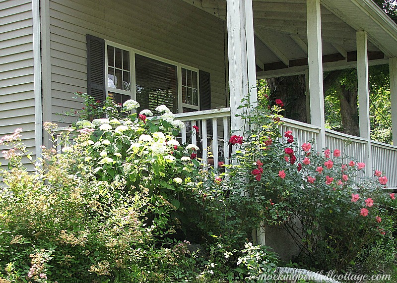 The area around the porch that you see in the above photo was completely bare when we moved in. Just grass. Now, I have a flourishing cottage garden that adds to the charm of this old house.