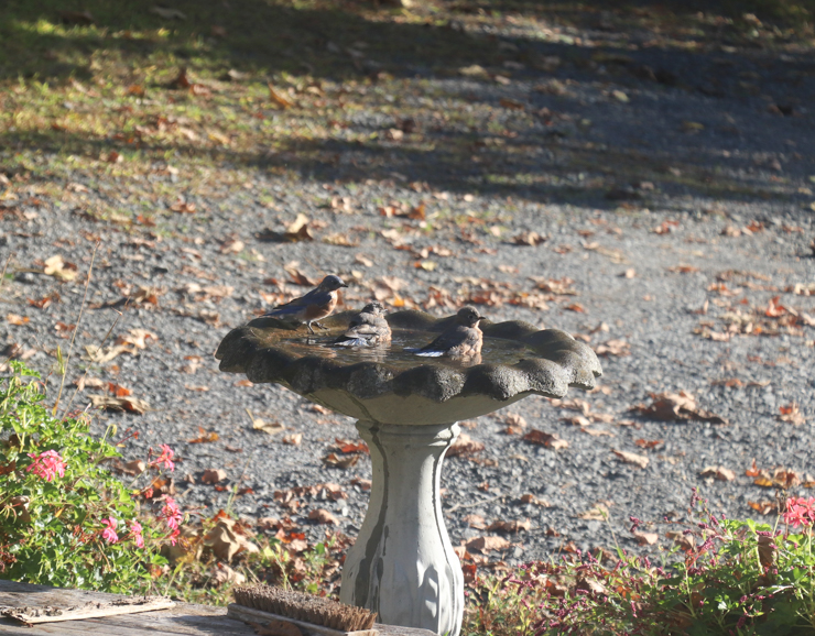 Migrating bluebirds stopping for a drink and a bath: